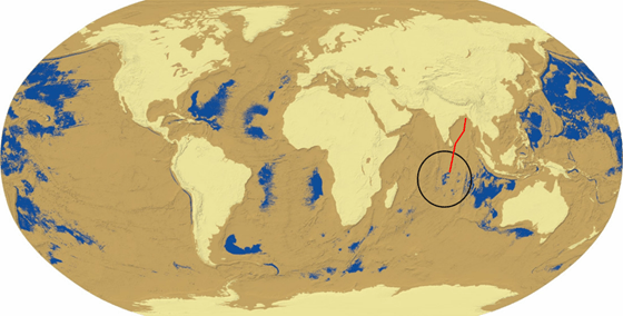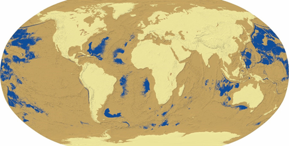 Figure 2. A model of land and sea distributions in pre-Flood Earth shows formerly subaerial but now-submerged landscapes (tan), presently exposed landscapes (beige), and former oceans and seas (blue). The pre-flood extent of the Mediterranean Sea is not shown as blue because the bottom of the basin is at an altitude above that used to create the tan regions.