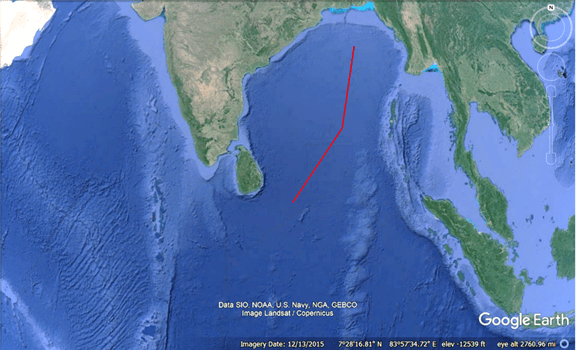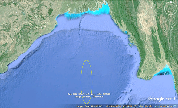Figure 3. IODP Expedition 354 drill site’s location is indicated by the pin on the left image. On the right is a portion of the present-day subaerial Ganges.
