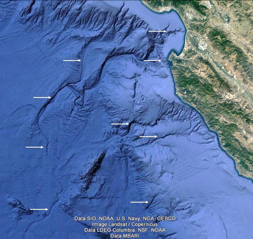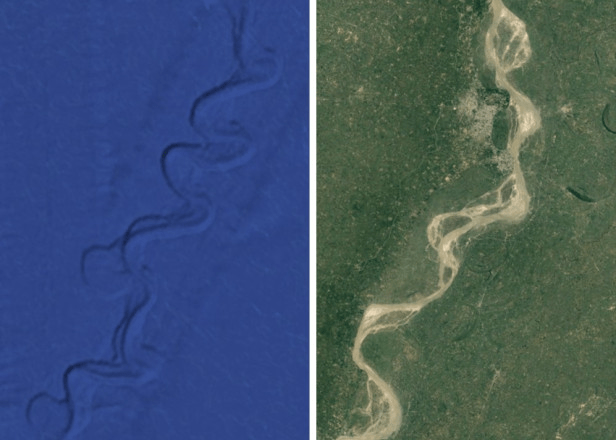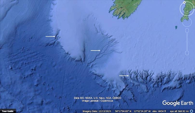 The images in Figure 1 (a)-(d) depict submerged landscapes from around the planet. Such maps represent new data, as they became ubiquitously available circa 2010. In each figure the white arrows identify submerged rivers and drainage systems that appear to be well-preserved. Many of the systems find their terminus hundreds of kilometers from present coasts and at depths greater than 3000 meters below present sea level.
