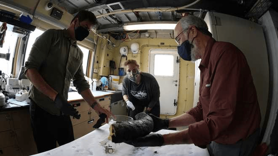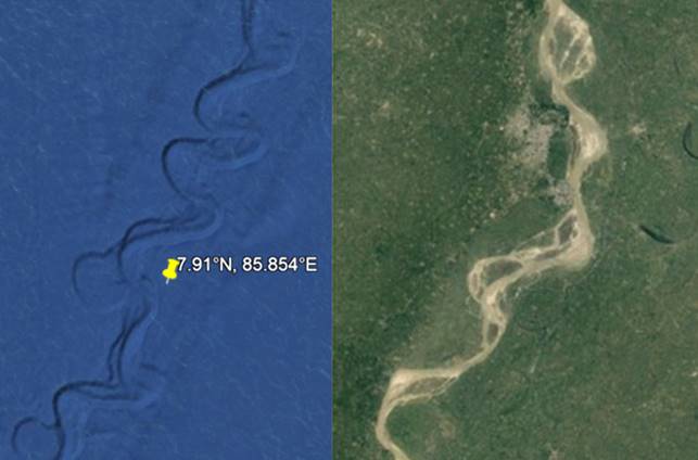 Similarly, International Ocean Discovery Program (IODP) Expedition 354 recently discovered abundant woody debris in the Bay of Bengal 3.7 km beneath the surface and preserved within coarse sediment layers of turbidite beds with recovery spanning 19 My, delivered episodically in high-magnitude, low-frequency wood export events.[18] The wood samples were found at various layers of core samples obtained 1600 km from where the Ganges and other systems flow into the Bengal Fan. Implied by the report is that somehow the tree fragments survived extensive transport and deposit in coarse sediments to become submerged beneath 3.7 km of water, millions of years apart, and at the exact location. Under No Flood, the transport and deposition mechanisms cannot be explained. However, in the proper context that there was a worldwide flood, the discovery of the wood samples from sandy cores is simply explained: prior to The Flood, the Ganges and other river systems carried water down the continental shelf and then southward into abyssal regions, and the rivers suffered episodic, high-magnitude, low frequency wood export events, or floods. Such floods were of sufficient velocity to transport coarse sediments that preserved the wood fragments in riparian regions. The age discrepancy in the recovered samples indicates that the river suffered floods for millions of years, and we now discover them submerged in the Bay of Bengal beneath 3.7 km of Flood water. For visual corroboration, the image on the left of Figure 3 identifies the drill location from which the IODP wood samples were obtained, and on the right is a portion of the present-day Ganges.