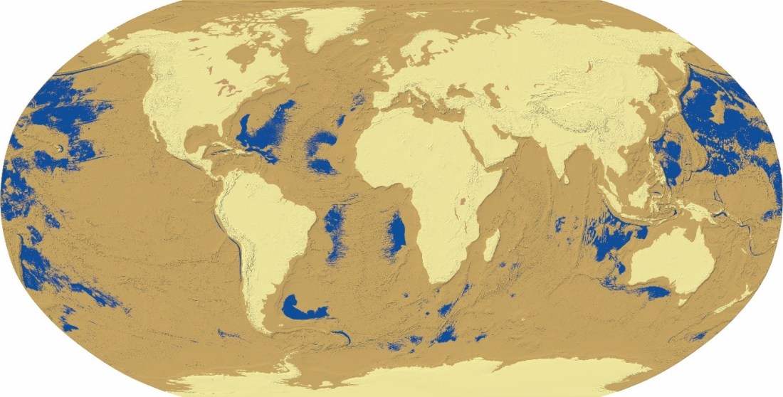 Instead, we come from landscapes that are now under more than two miles of water – our homelands were submerged approximately 12,800 years ago during a planet-altering event that took place in a geological eyeblink. Rather than being “out of Africa,” we are instead from vast portions of the dark tan regions depicted on the map below, a model of pre-Flood Earth (found in my paper and book). The blue regions approximate pre-flood oceans and seas, and the beige regions represent presently exposed landscapes.